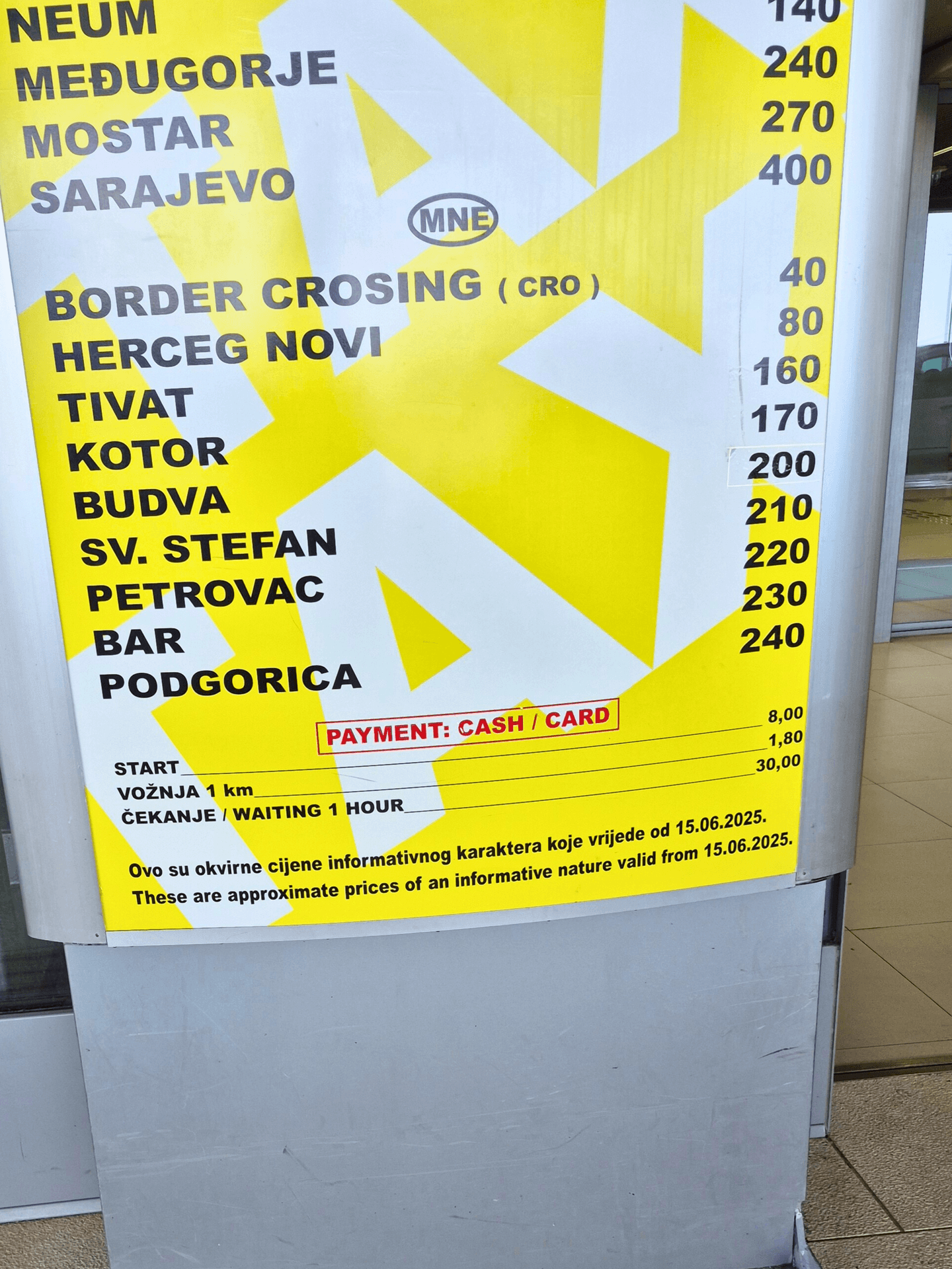 Si vous demandez "Border Crosing"cro, le taxi vous déposera au poste frontière côté Croatie "grande frontière". Le poste frontière du Monténégro est en environ 3 km de ce dernier.